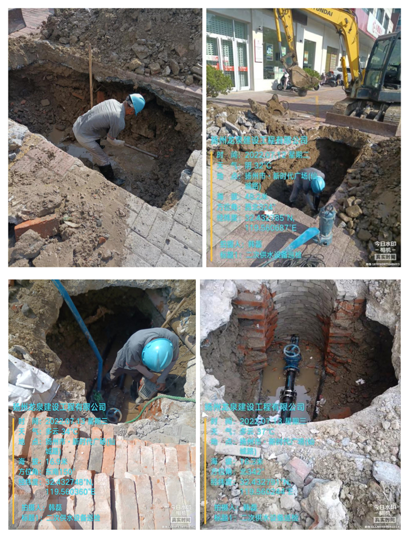 今年三伏天,高溫和暴曬持續(xù)不斷,天氣異常炎熱。7月13日,新時代廣場高層供水管道破裂。龍泉公司接到客服部工單后,維修部與高層供水運管部對新時代廣場周圍進行漏點排查,在華夏銀行門口發(fā)現(xiàn)高層管道破裂,導(dǎo)致高層用戶水壓偏低。隨后工作人員立即調(diào)來人員和機械進行緊急搶修。定位、圍擋、開挖、排水、定方案,所有工序緊鑼密鼓、有條不紊。經(jīng)過通力協(xié)作,下午時間搶修完畢,恢復(fù)正常供水。