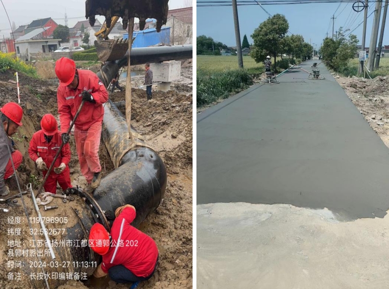 本次施工過(guò)程難度大,時(shí)間緊,作業(yè)人員不分晝夜,不懼艱苦,于2024年5月完工,并幫老百姓恢復(fù)損壞的路面。