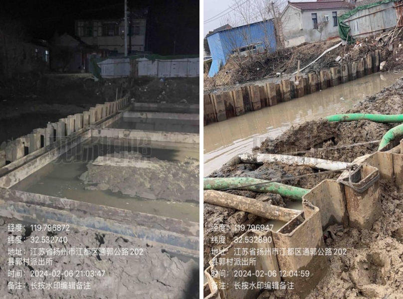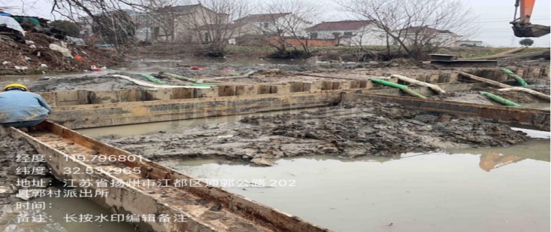 在施工過(guò)程中,東側(cè)原造橋壩頭設(shè)置過(guò)高,上游自來(lái)水漏水嚴(yán)重,挖機(jī)無(wú)法進(jìn)場(chǎng)施工,人工拆除兩道壩頭。施工總體步驟:草袋圍堰支護(hù),支護(hù)內(nèi)明排水,靜壓打樁,圍堰施工,開挖,管道維修,管道打壓,回填,鋼板樁拆除,圍堰拆除。